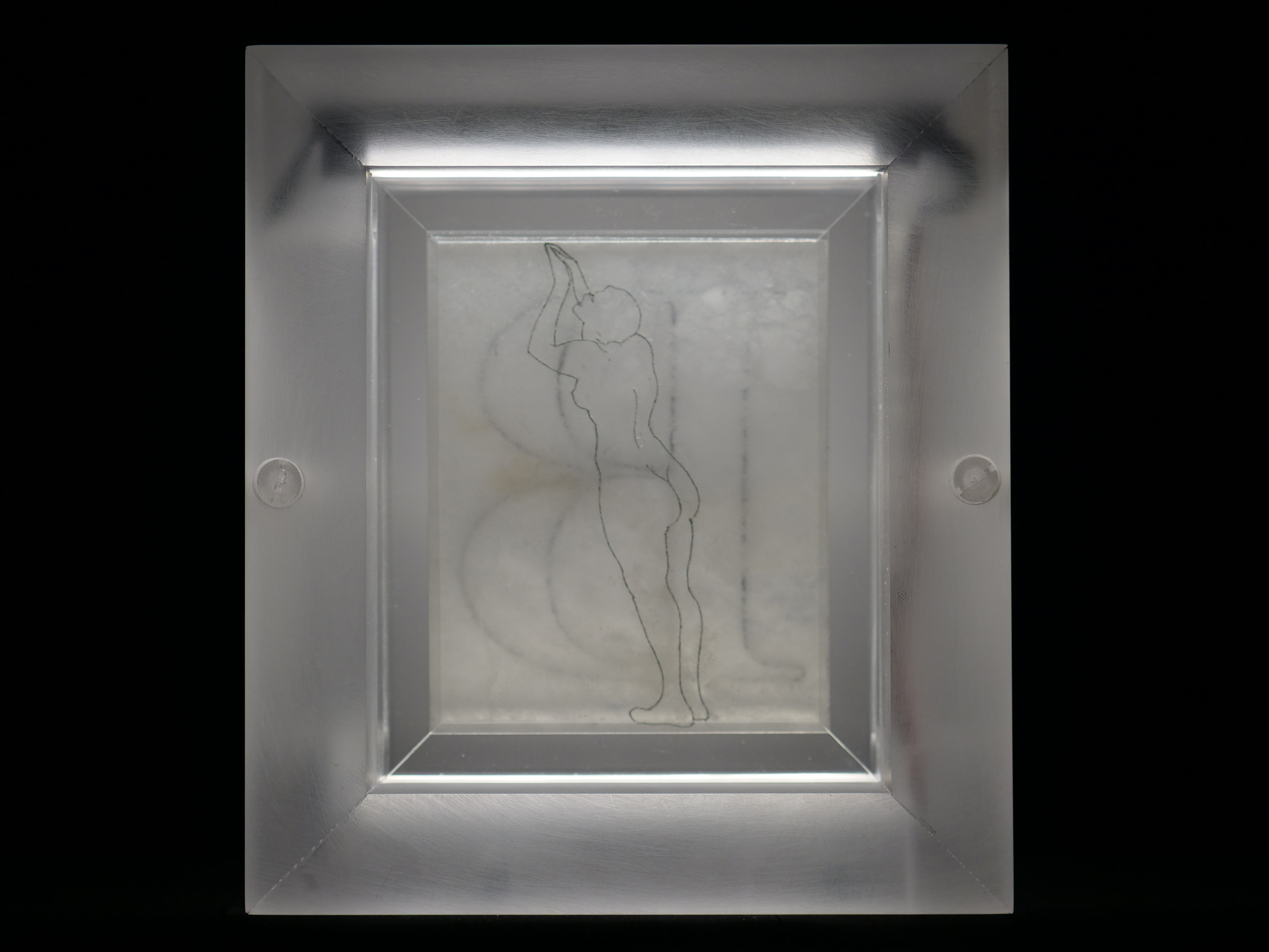 • Alabaster, - 4.25" x 5.5", Plexiglas, (8" x 6.25" overall ).