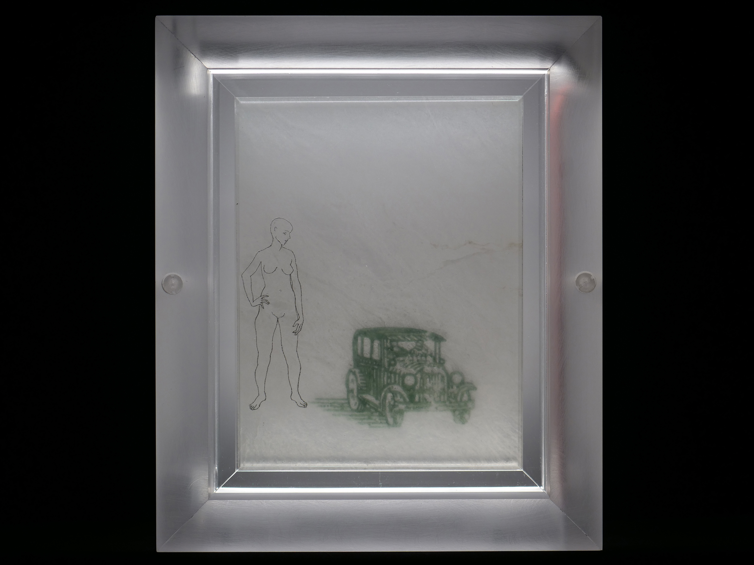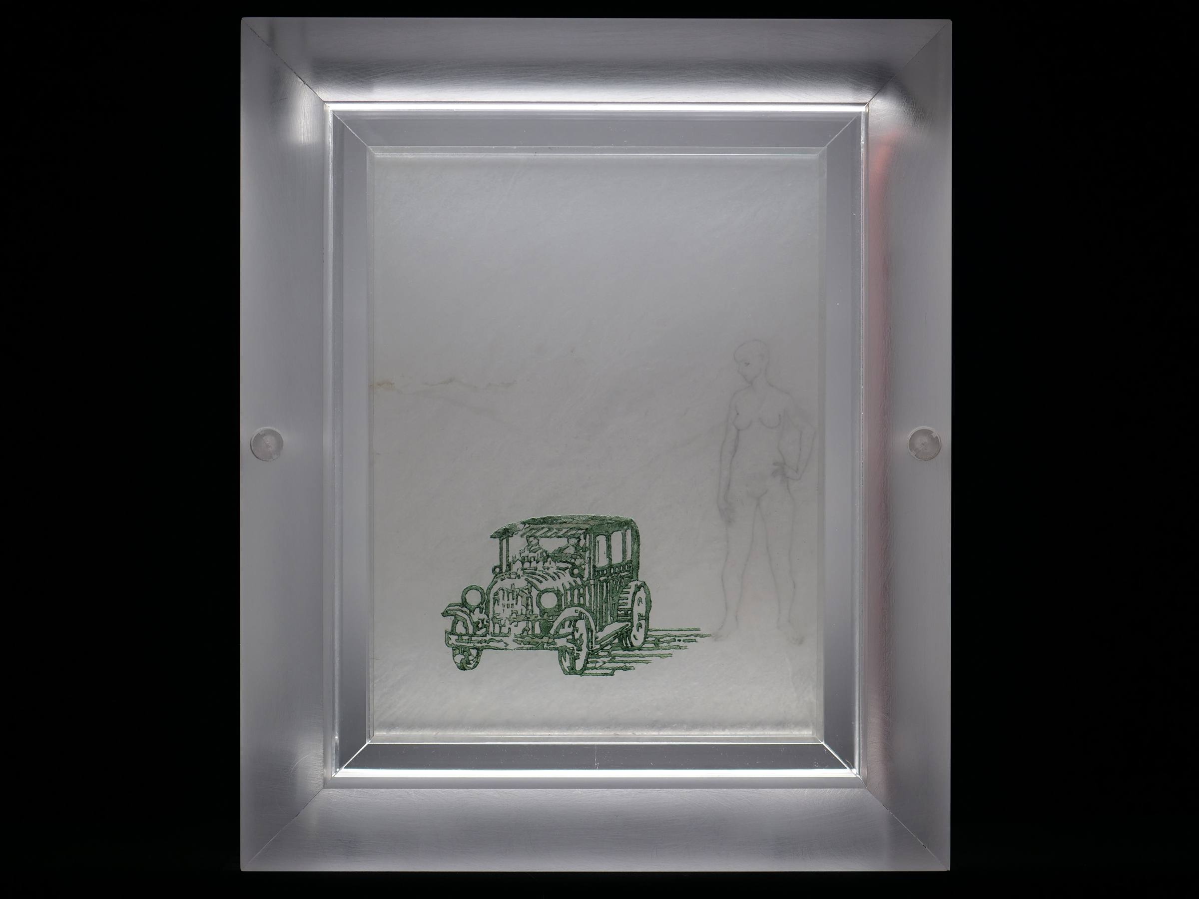 Illuminations; Commissioned by Davis and Louise Reimer, is a series of 30 Translucent Alabaster plates floated and illuminated in Plexiglass frames. Symbols from United States Currency drawn with green Currency ink on one side of the plate, interact with line figures drawn with black currency ink on the reverse side of the alabaster creating a ghostly poetic relationship.