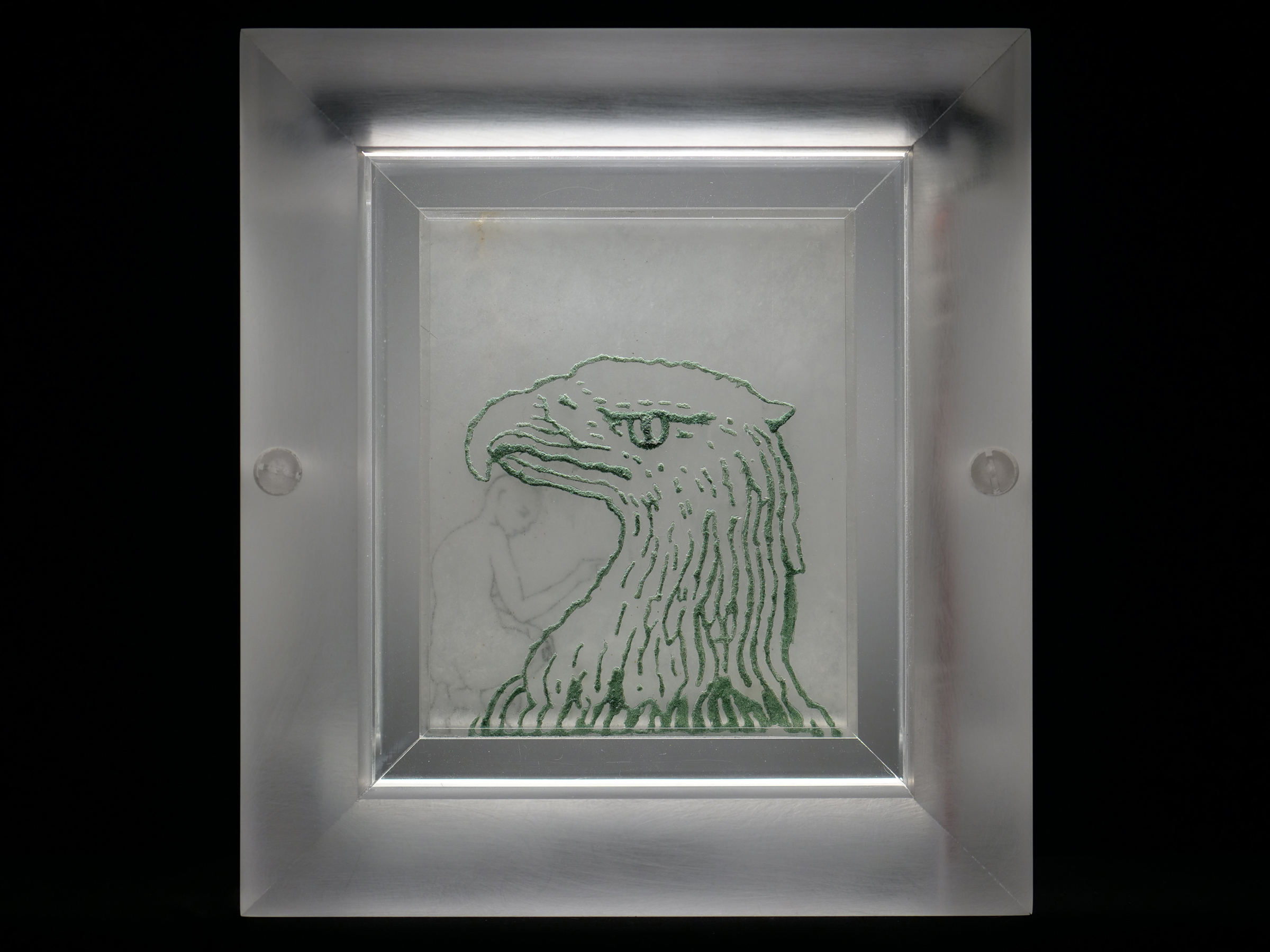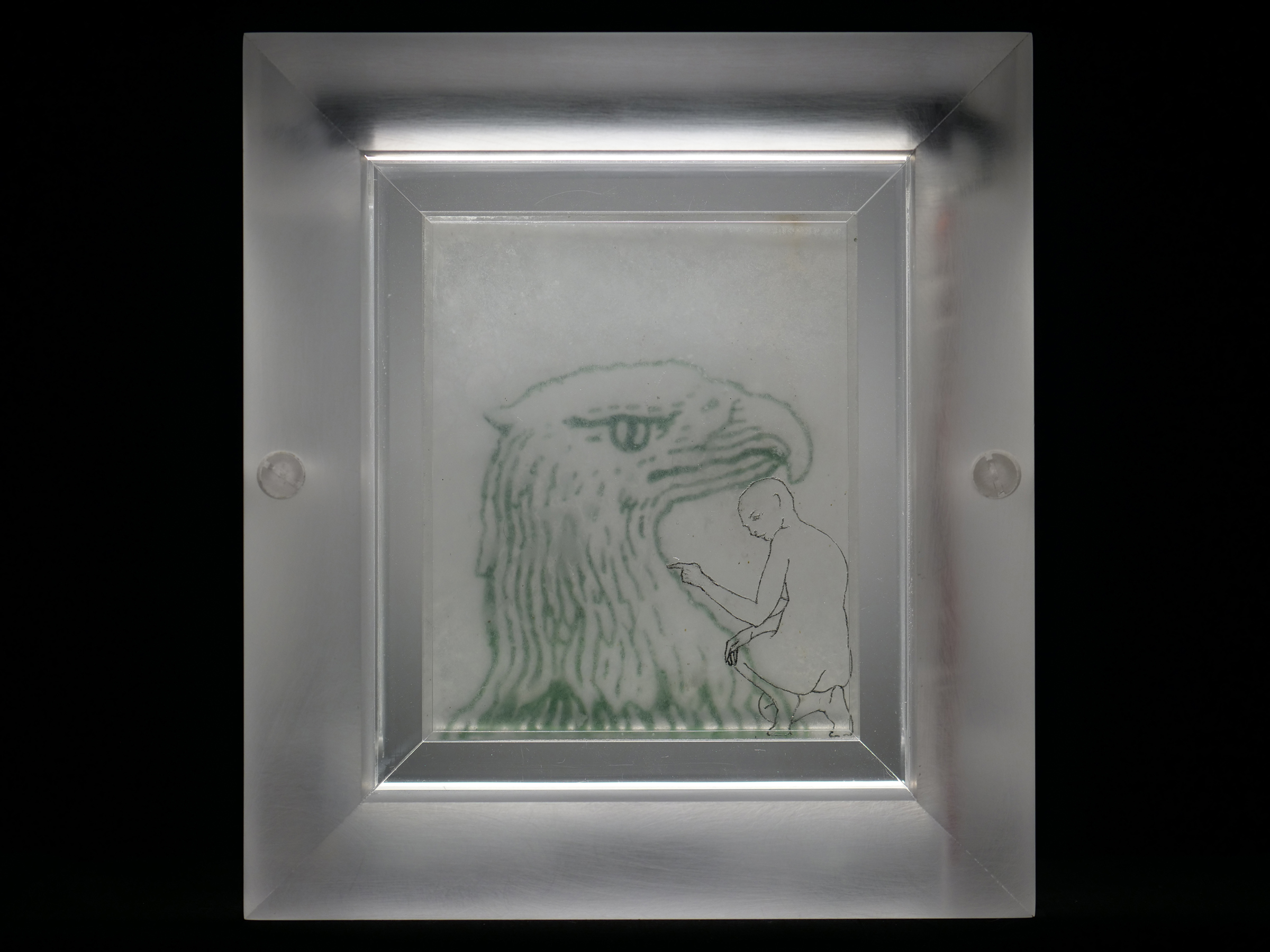 Illuminations; Commissioned by Davis and Louise Reimer, is a series of 30 Translucent Alabaster plates floated and illuminated in Plexiglass frames. Symbols from United States Currency drawn with green Currency ink on one side of the plate, interact with line figures drawn with black currency ink on the reverse side of the alabaster creating a ghostly poetic relationship.