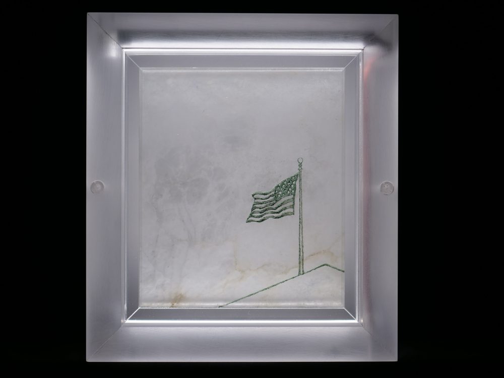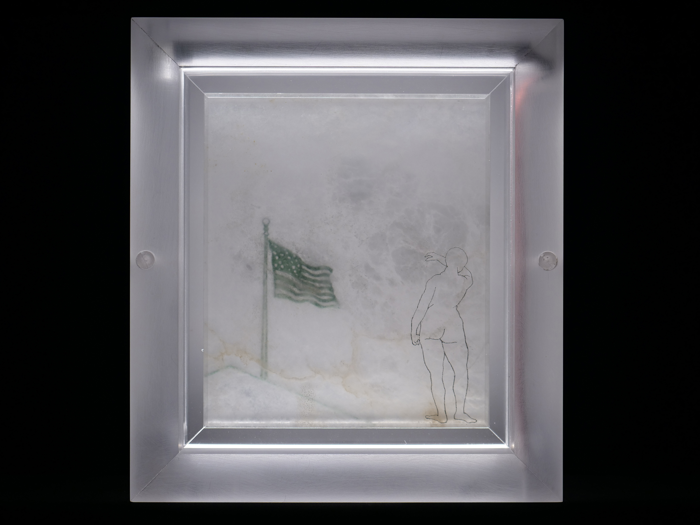Illuminations; Commissioned by Davis and Louise Reimer, is a series of 30 Translucent Alabaster plates floated and illuminated in Plexiglass frames. Symbols from United States Currency drawn with green Currency ink on one side of the plate, interact with line figures drawn with black currency ink on the reverse side of the alabaster creating a ghostly poetic relationship.