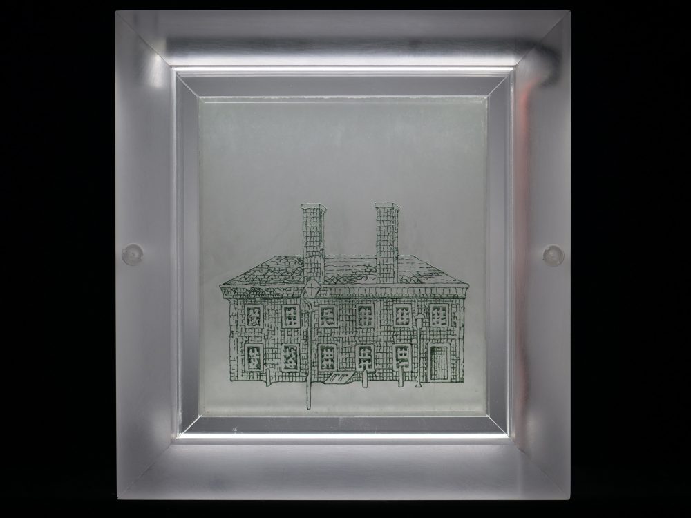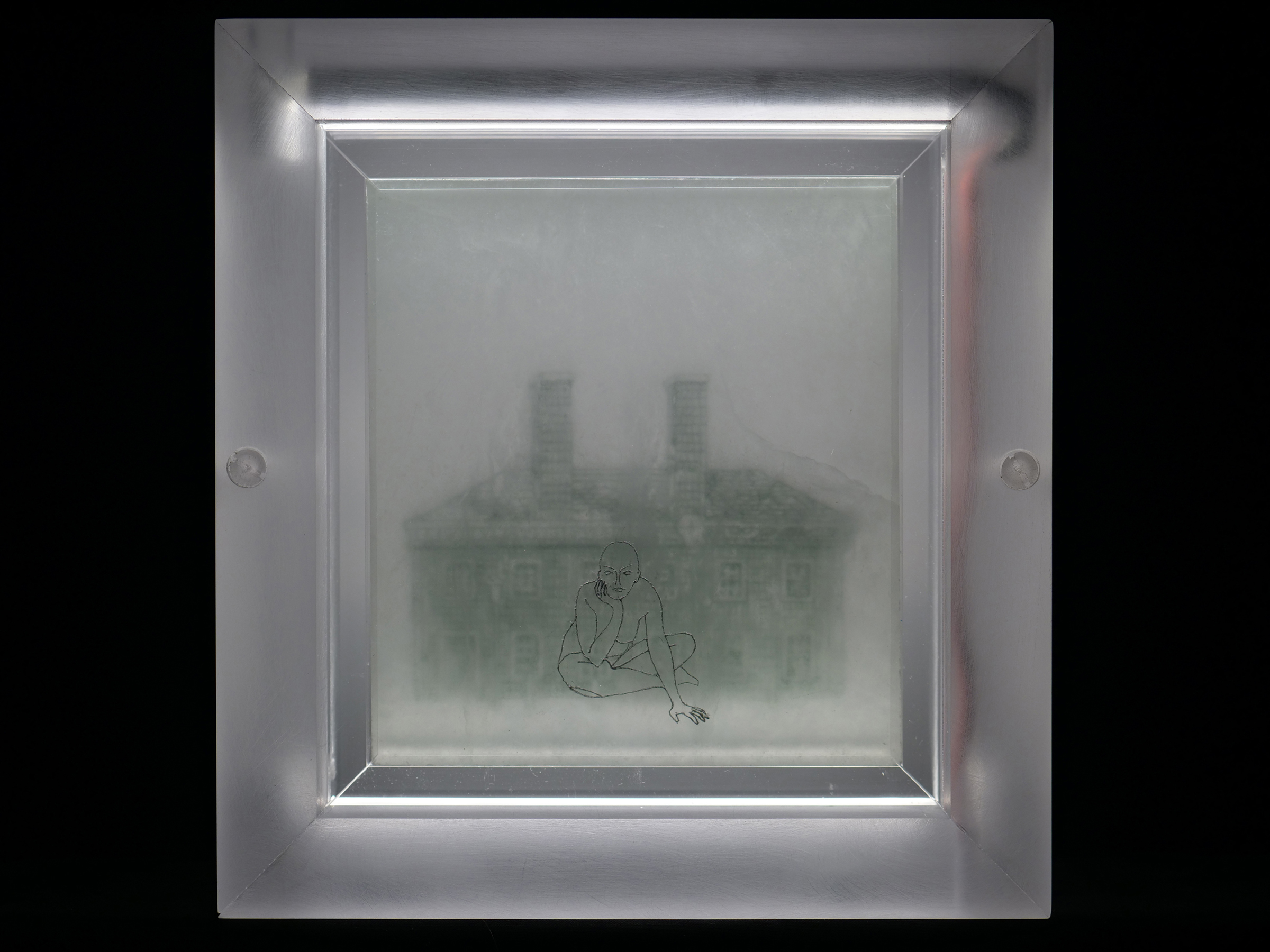 Illuminations; Commissioned by Davis and Louise Reimer, is a series of 30 Translucent Alabaster plates floated and illuminated in Plexiglass frames. Symbols from United States Currency drawn with green Currency ink on one side of the plate, interact with line figures drawn with black currency ink on the reverse side of the alabaster creating a ghostly poetic relationship.