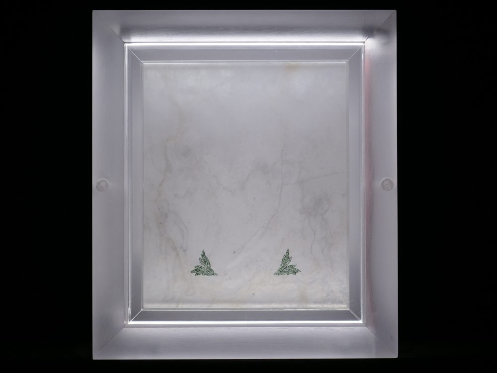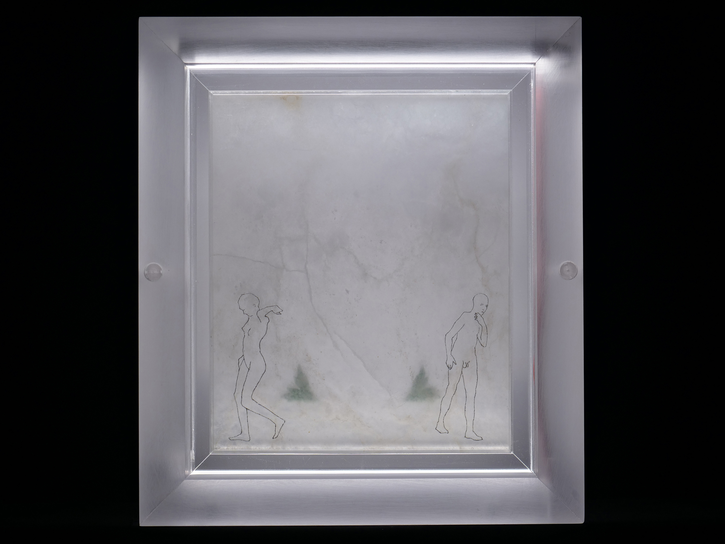 Illuminations; Commissioned by Davis and Louise Reimer, is a series of 30 Translucent Alabaster plates floated and illuminated in Plexiglas frames. Symbols from United States Currency drawn with green Currency ink on one side of the plate, interact with line figures drawn with black currency ink on the reverse side of the alabaster creating a ghostly poetic relationship.