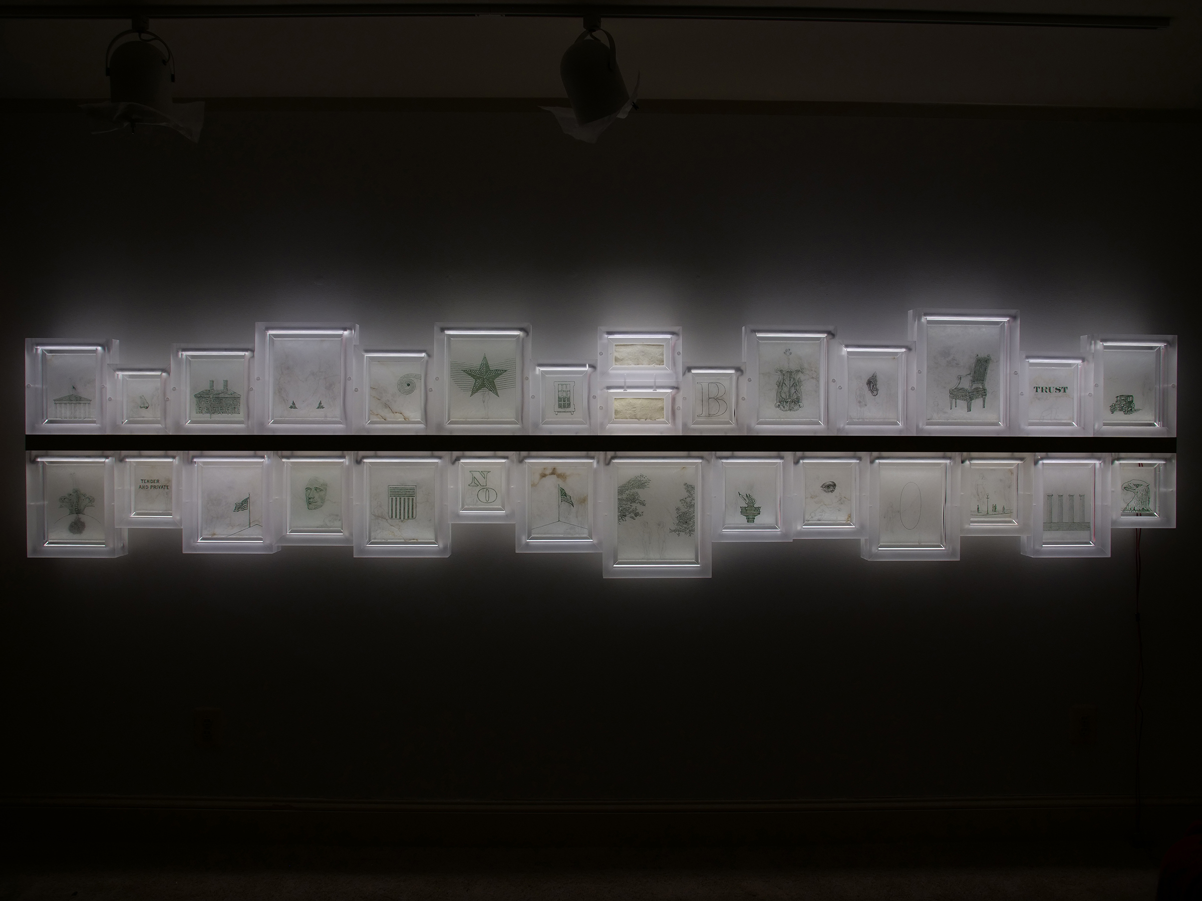 Bottom – #32 (Splash) , #15 (Tender Private), #10 ( Flag Left), #29 ( Hamilton Mask), #16 (Shield) , #12 (No), #19 ( Flag Right), #7 (Two Branches), #9 (Torch), #17 (Eye), #27(Big Oval), #25 (Street Corner), #18 (Columns), #2 (Eagle)Illuminations; Commissioned by Davis and Louise Reimer, is a series of 30 Translucent Alabaster plates floated and illuminated in Plexiglass frames. Symbols from United States Currency drawn with green Currency ink on one side of the plate, interact with line figures drawn with black currency ink on the reverse side of the alabaster creating a ghostly poetic relationship.