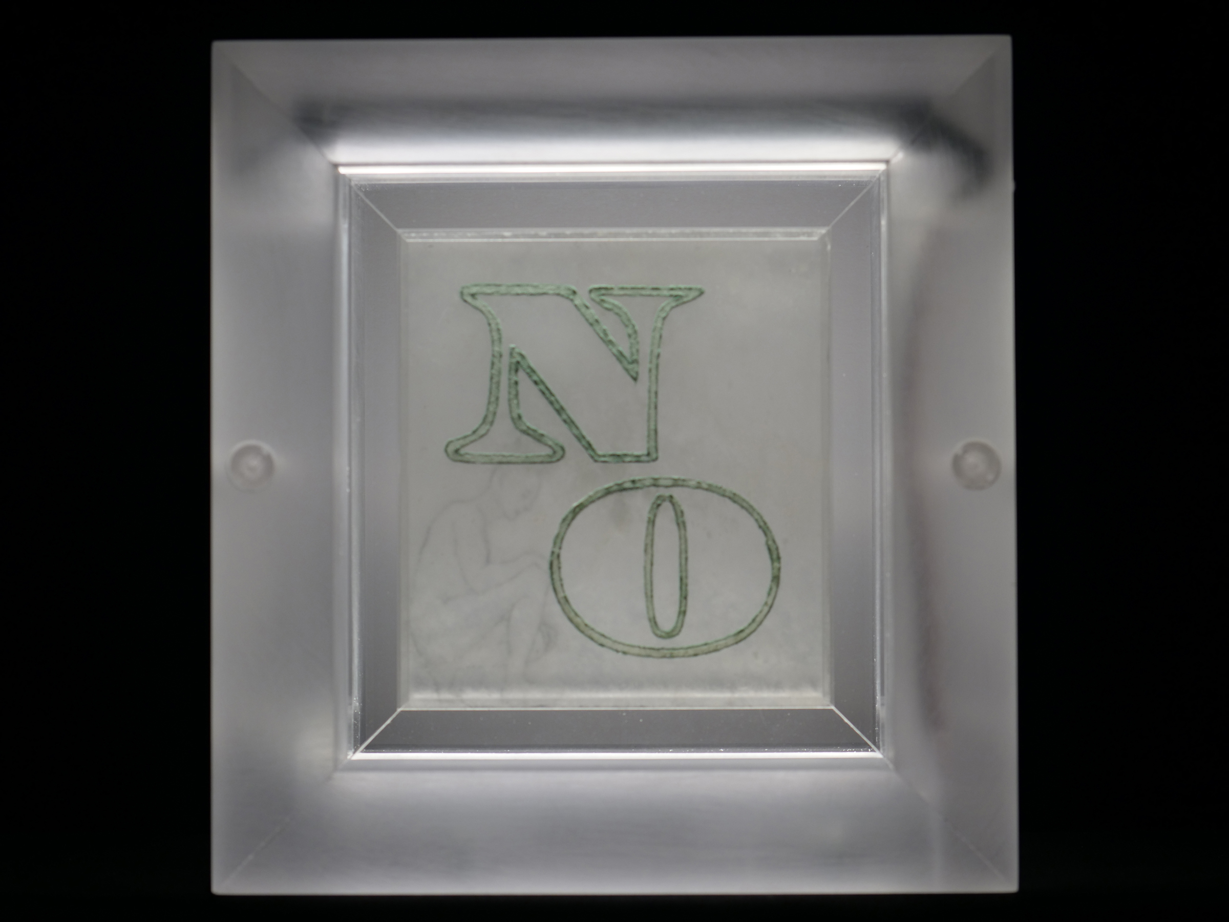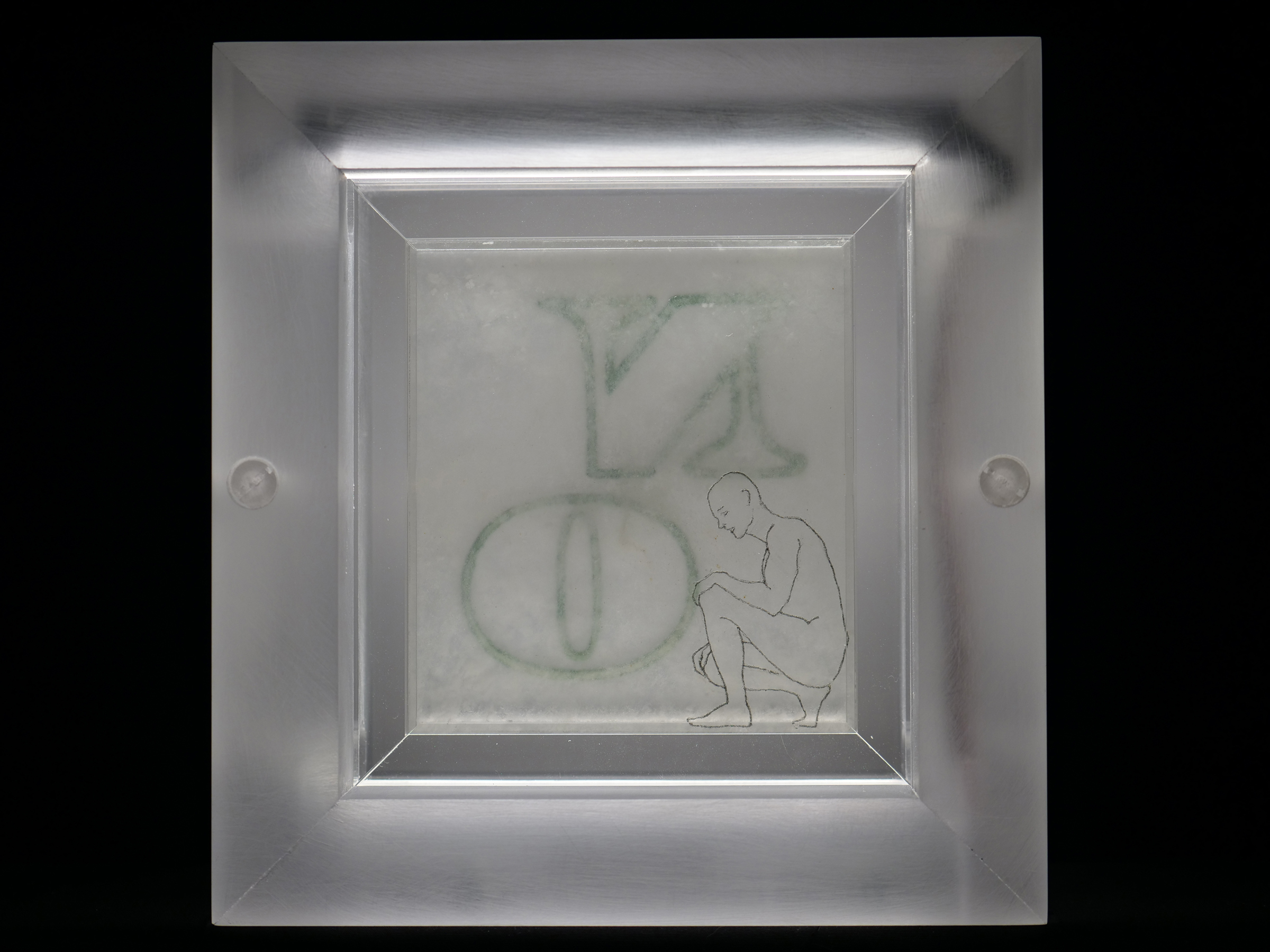 Illuminations; Commissioned by Davis and Louise Reimer, is a series of 30 Translucent Alabaster plates floated and illuminated in Plexiglass frames. Symbols from United States Currency drawn with green Currency ink on one side of the plate, interact with line figures drawn with black currency ink on the reverse side of the alabaster creating a ghostly poetic relationship.