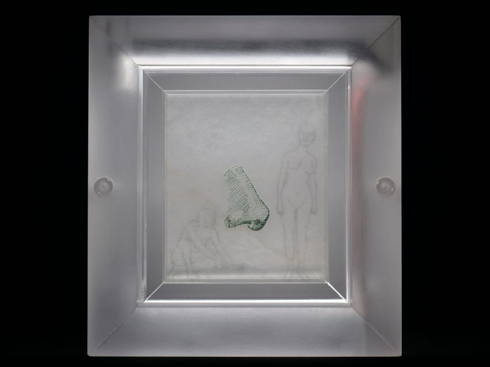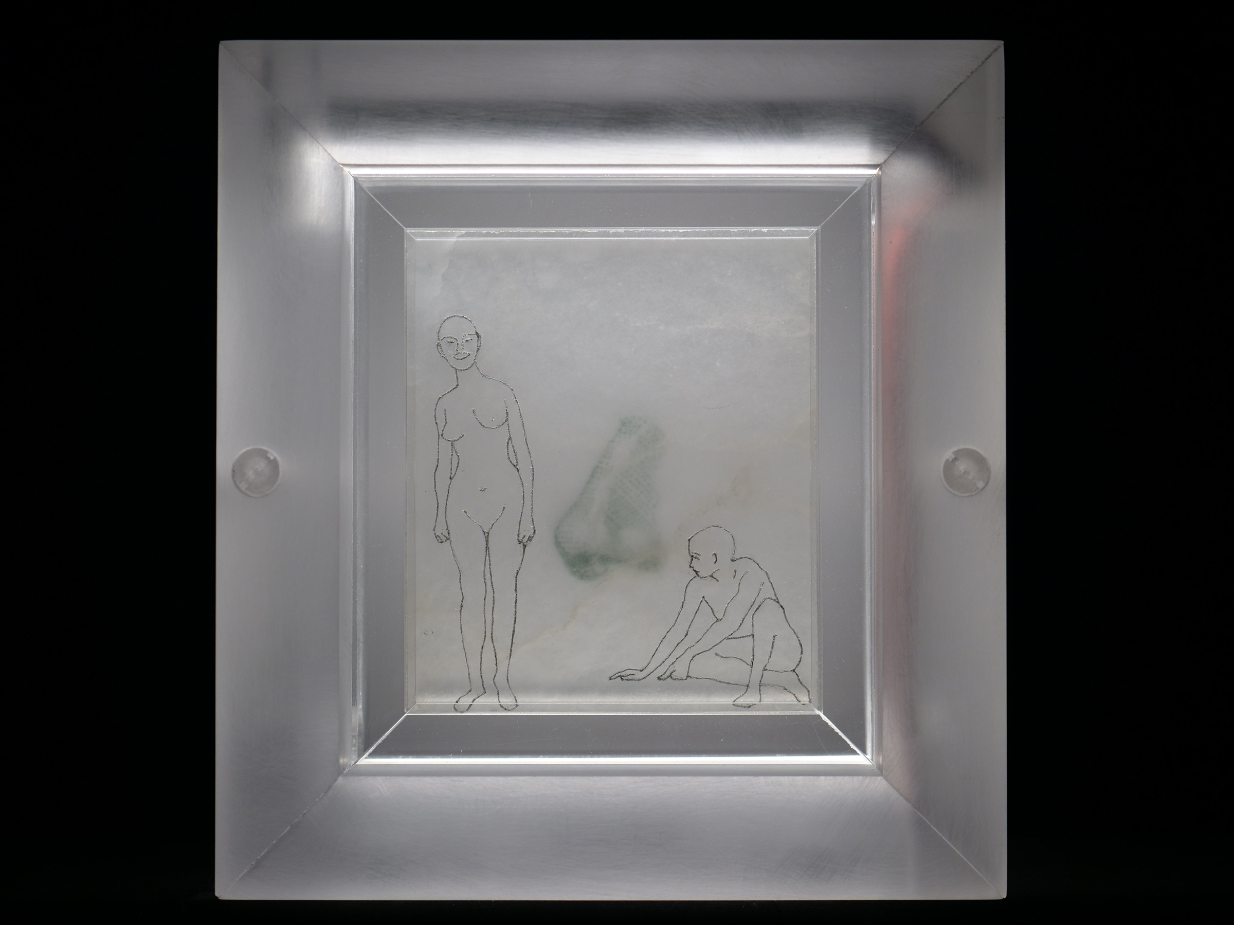 Illuminations; Commissioned by Davis and Louise Reimer, is a series of 30 Translucent Alabaster plates floated and illuminated in Plexiglass frames. Symbols from United States Currency drawn with green Currency ink on one side of the plate, interact with line figures drawn with black currency ink on the reverse side of the alabaster creating a ghostly poetic relationship.