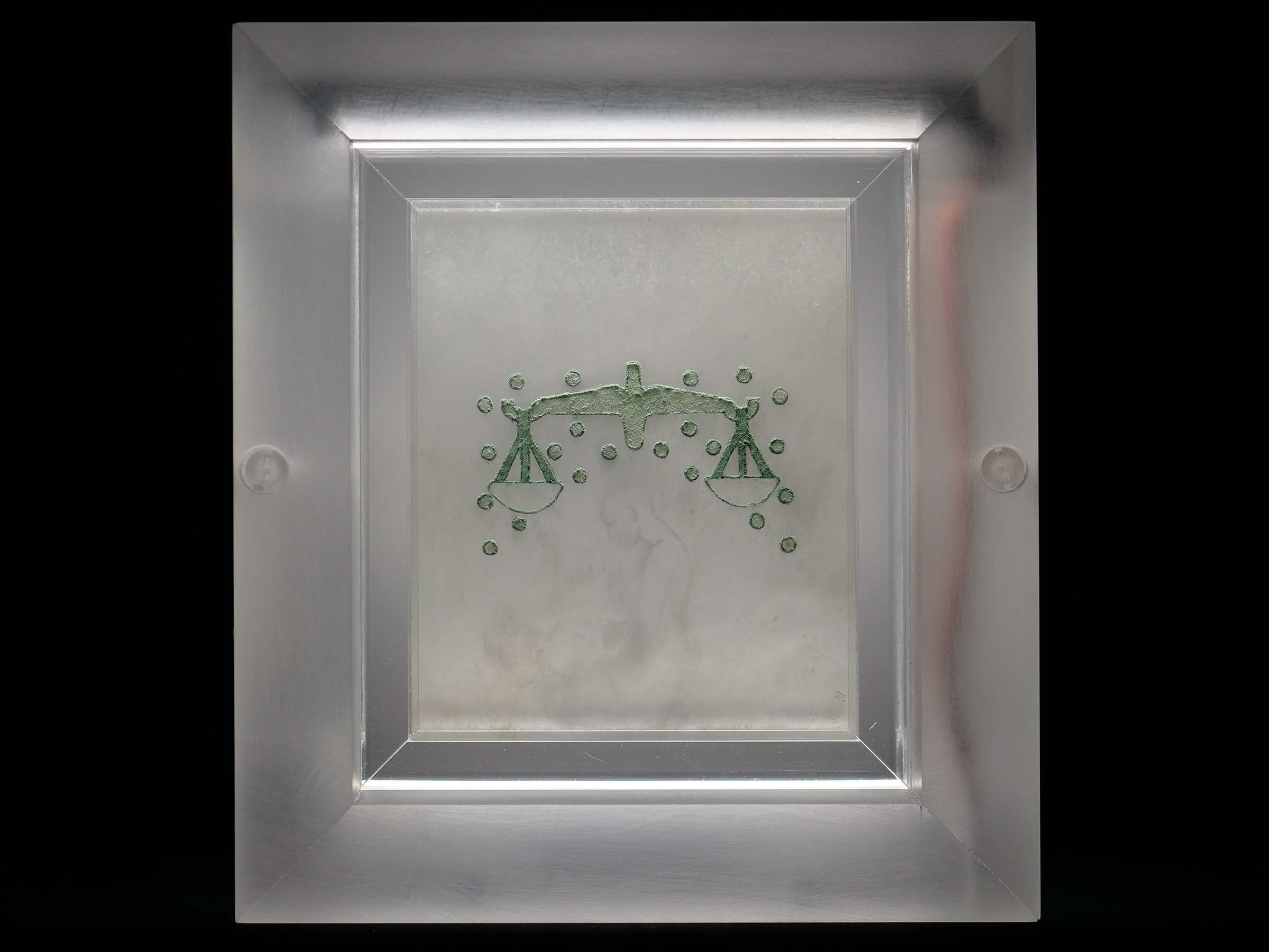DIMMER CONTROL BOX: This box contains two led drivers with dimmers for control of the top and bottom embedded led cob lights inside the Acrylic frame. Full brightness and dimming control is available. The box includes two 120v extension/power cables and connection leads to the framed artwork – $11,000.00