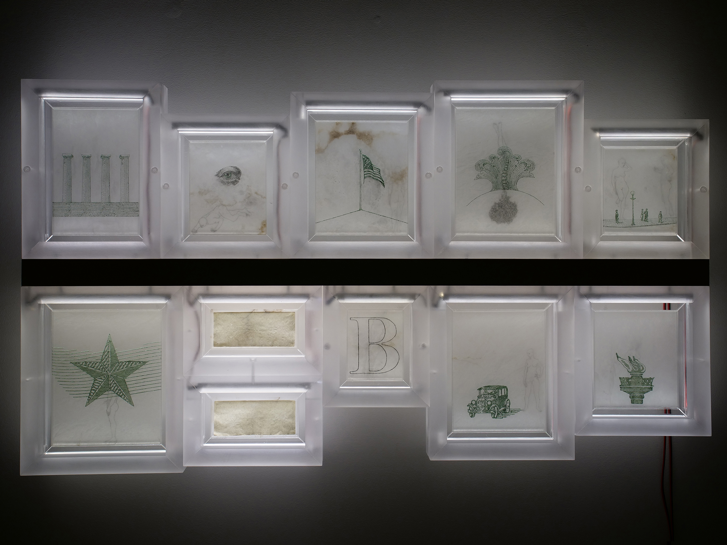 Illuminations; Commissioned by Davis and Louise Reimer, is a series of 30 Translucent Alabaster plates floated and illuminated in Plexiglass frames. Symbols from United States Currency drawn with green Currency ink on one side of the plate, interact with line figures drawn with black currency ink on the reverse side of the alabaster creating a ghostly poetic relationship.