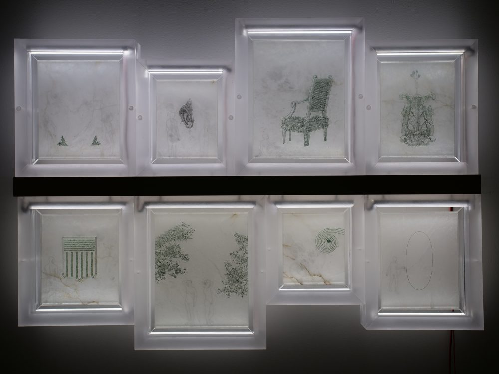 • Currency Ink, Alabaster, Plexiglas, cob lights, - #23 ( Lily Leaves). #8 (Ear), #26 (Chair), #6 (Urn) - // - #16 (Shield) , #7 (Two Branches), #30 (Swirl), #27 (Big Oval