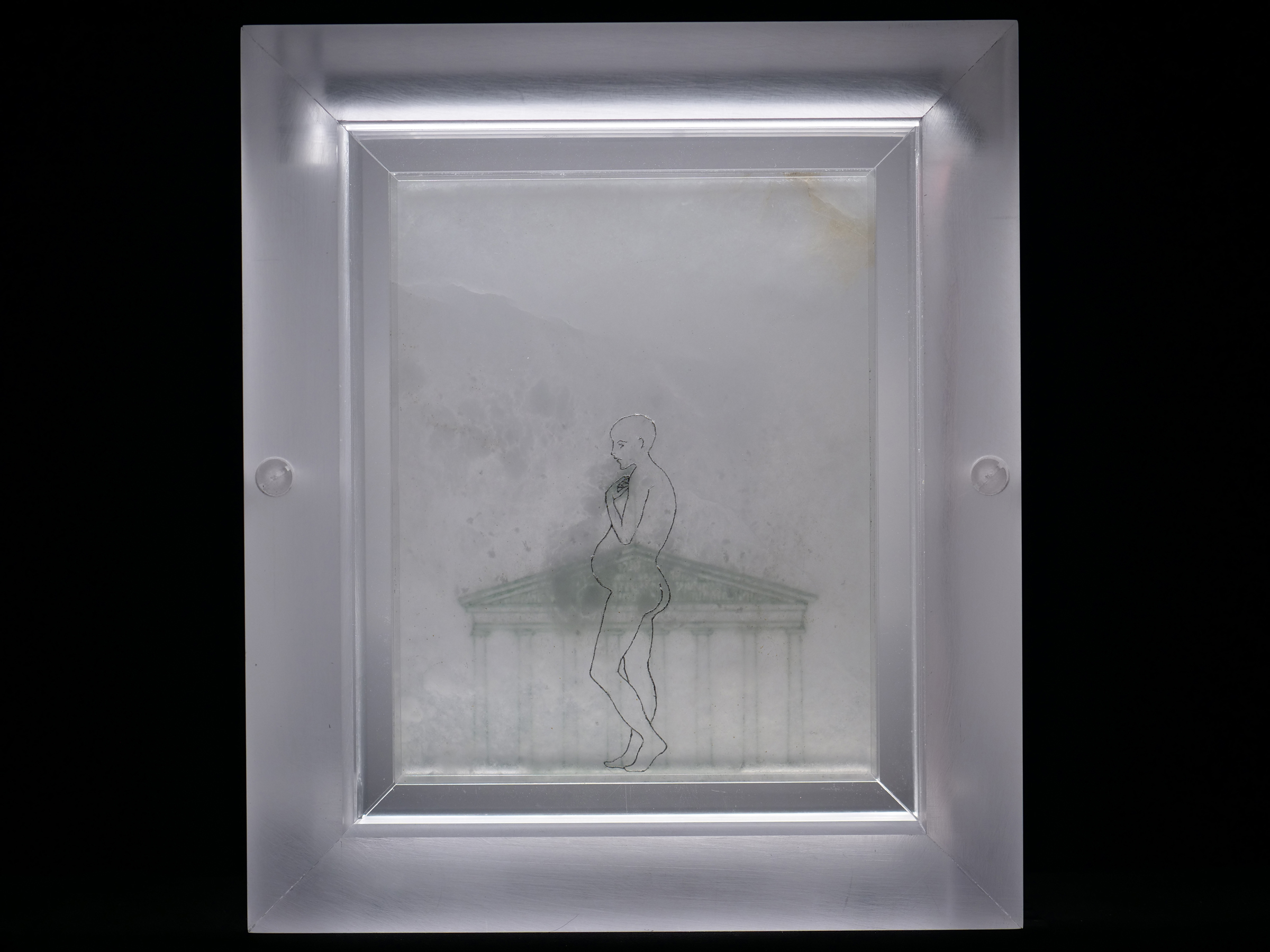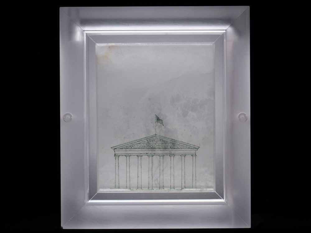 Illuminations; Commissioned by Davis and Louise Reimer, is a series of 30 Translucent Alabaster plates floated and illuminated in Plexiglass frames. Symbols from United States Currency drawn with green Currency ink on one side of the plate, interact with line figures drawn with black currency ink on the reverse side of the alabaster creating a ghostly poetic re