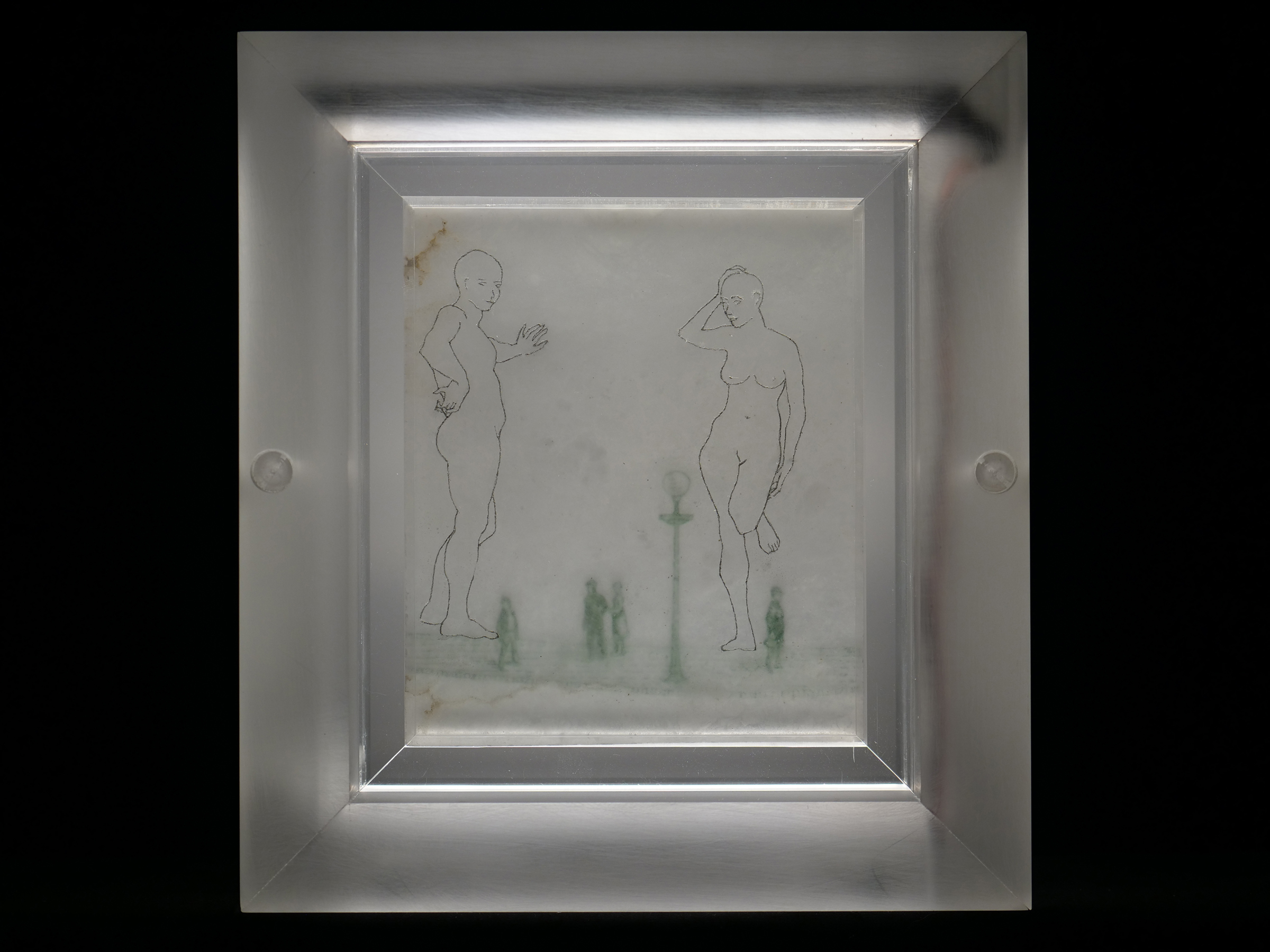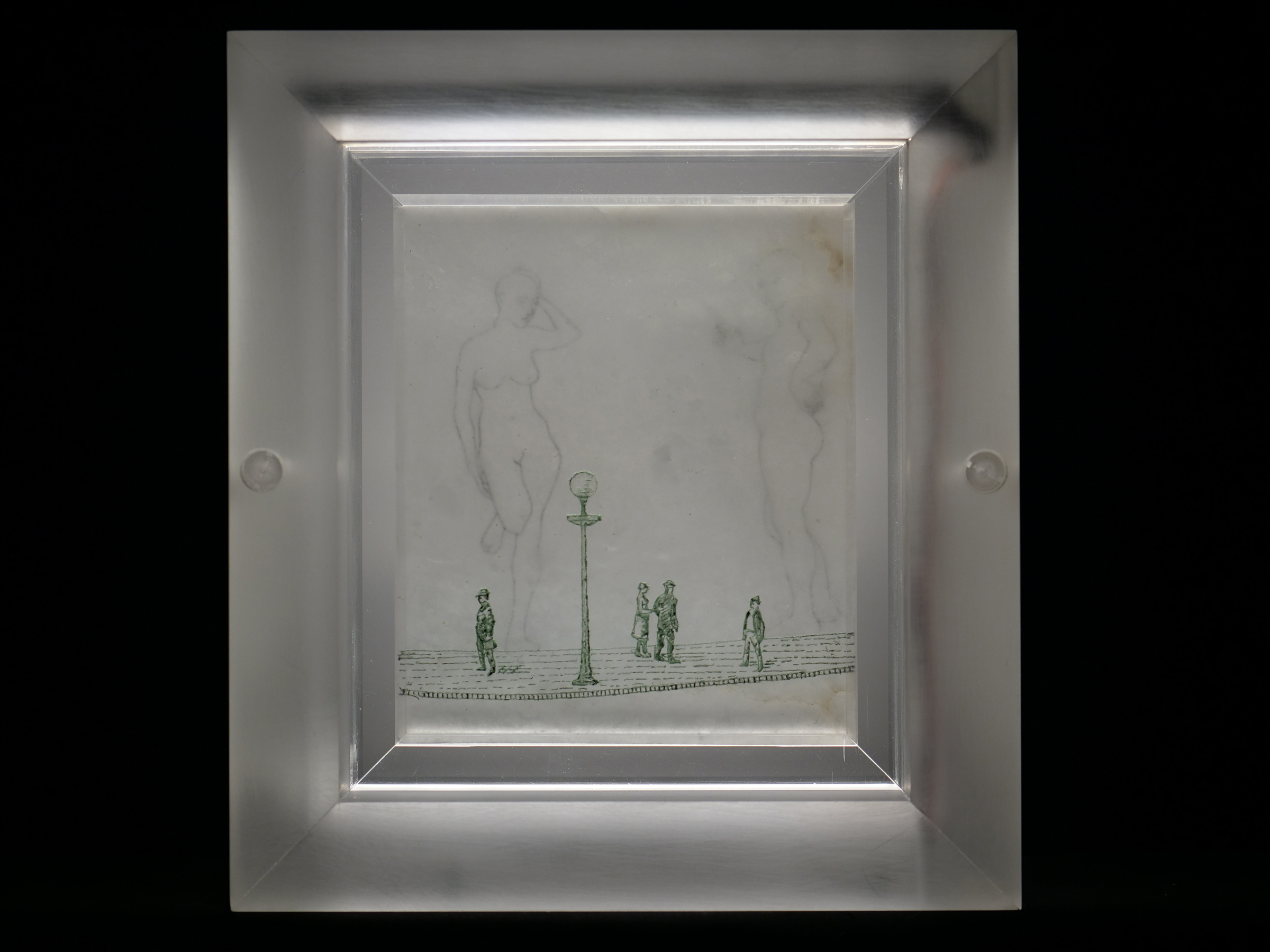 Illuminations; Commissioned by Davis and Louise Reimer, is a series of 30 Translucent Alabaster plates floated and illuminated in Plexiglass frames. Symbols from United States Currency drawn with green Currency ink on one side of the plate, interact with line figures drawn with black currency ink on the reverse side of the alabaster creating a ghostly poetic relationship.