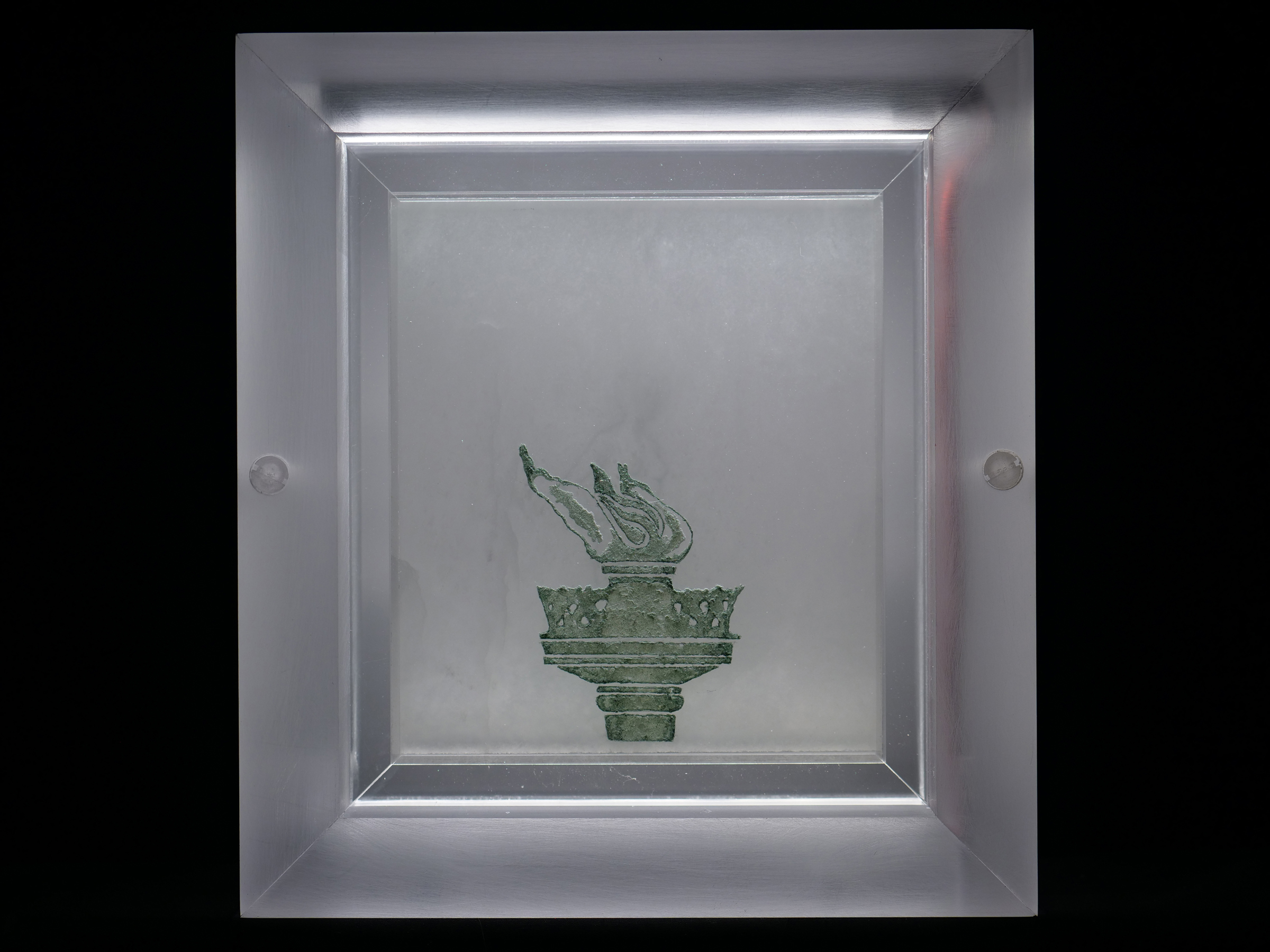Illuminations; Commissioned by Davis and Louise Reimer, is a series of 30 Translucent Alabaster plates floated and illuminated in Plexiglass frames. Symbols from United States Currency drawn with green Currency ink on one side of the plate, interact with line figures drawn with black currency ink on the reverse side of the alabaster creating a ghostly poetic relationship.
