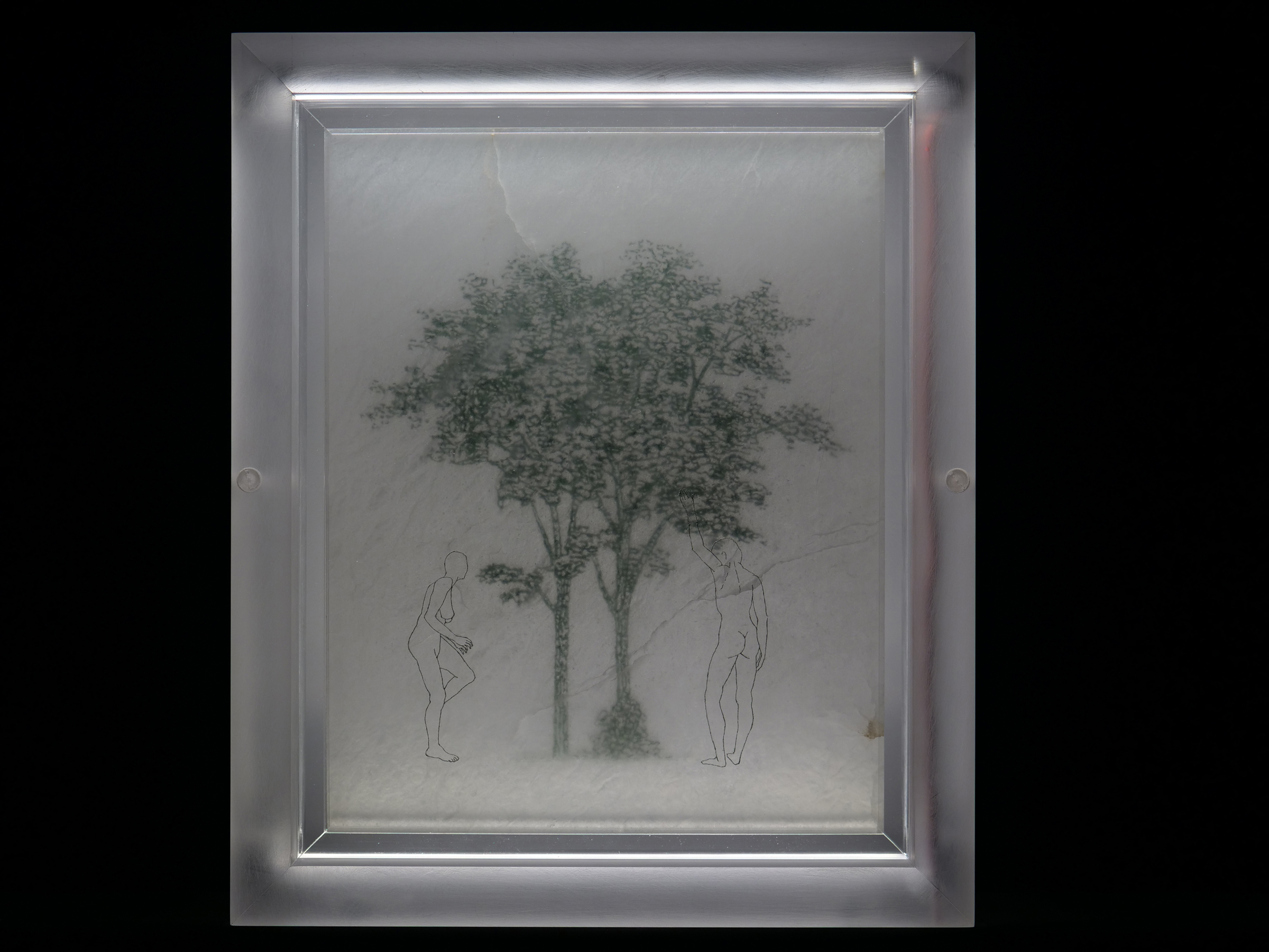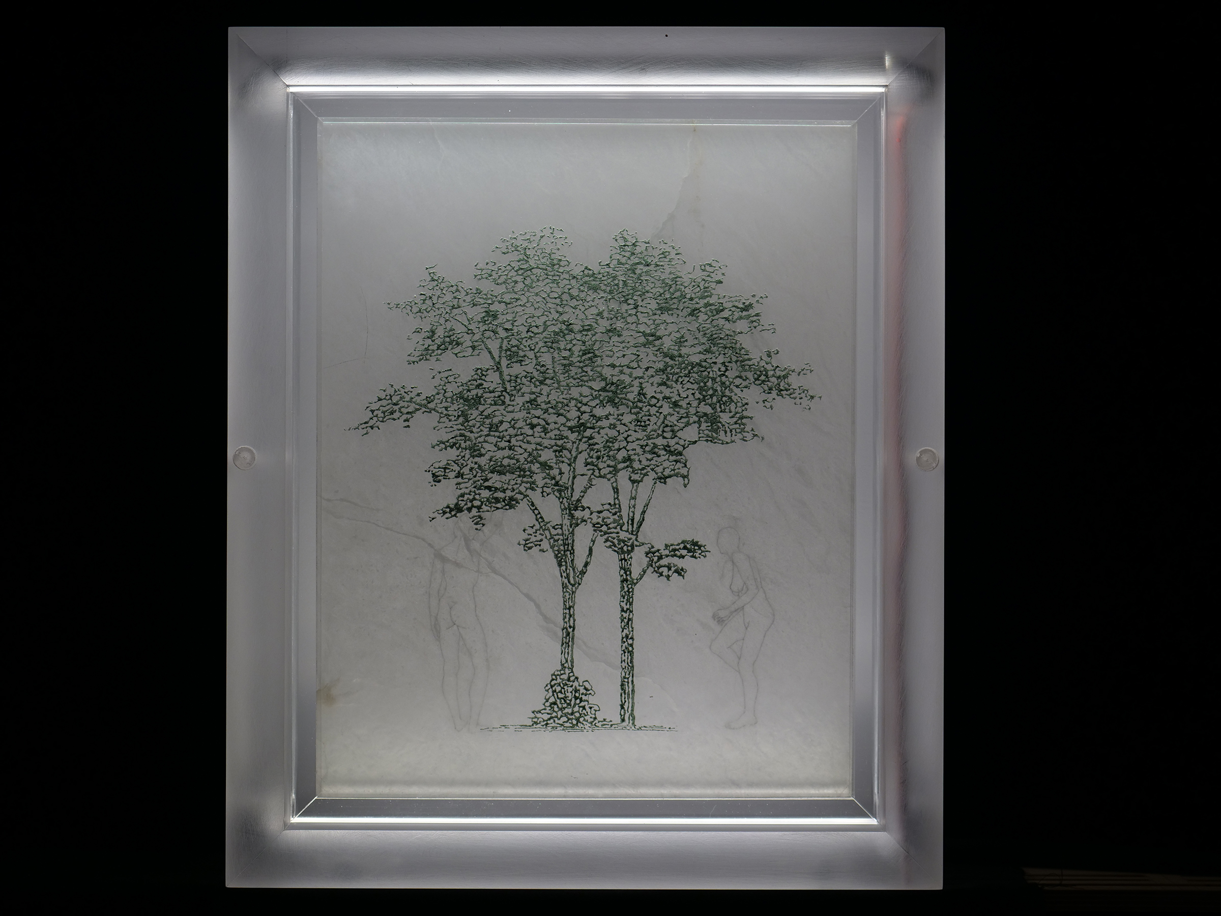 Illuminations; Commissioned by Davis and Louise Reimer, is a series of 30 Translucent Alabaster plates floated and illuminated in Plexiglass frames. Symbols from United States Currency drawn with green Currency ink on one side of the plate, interact with line figures drawn with black currency ink on the reverse side of the alabaster creating a ghostly poetic relationship.