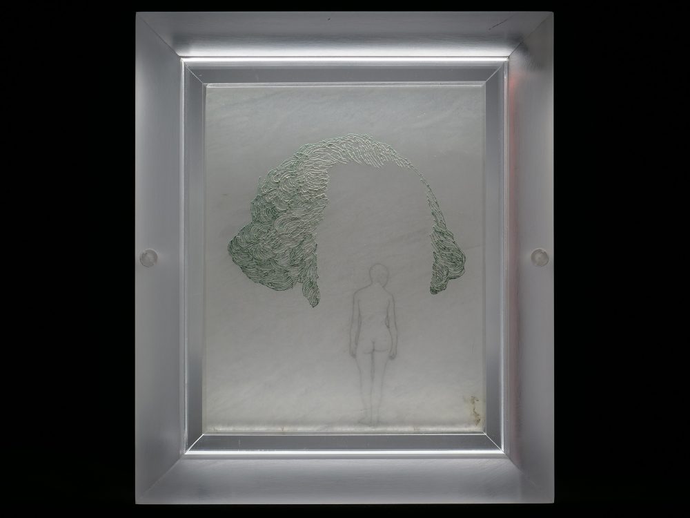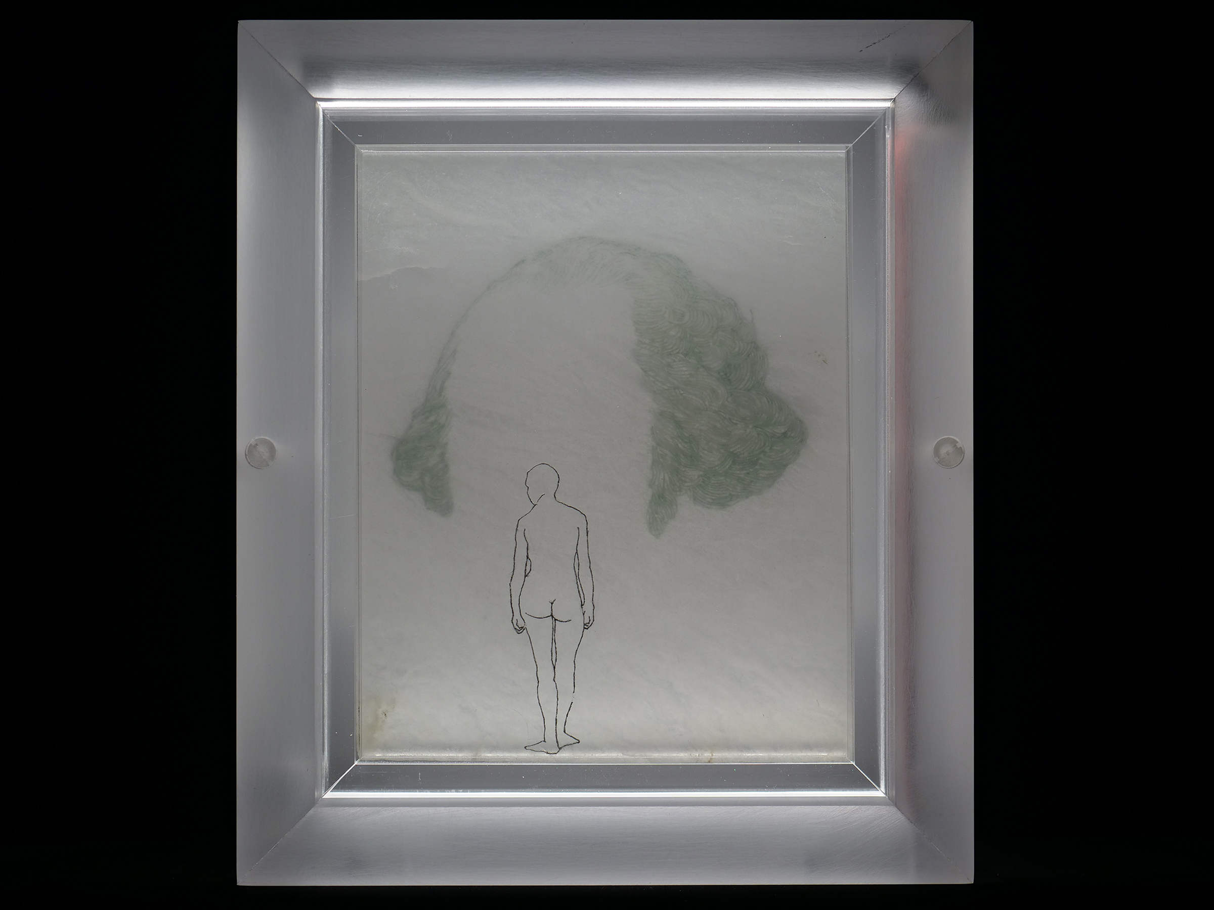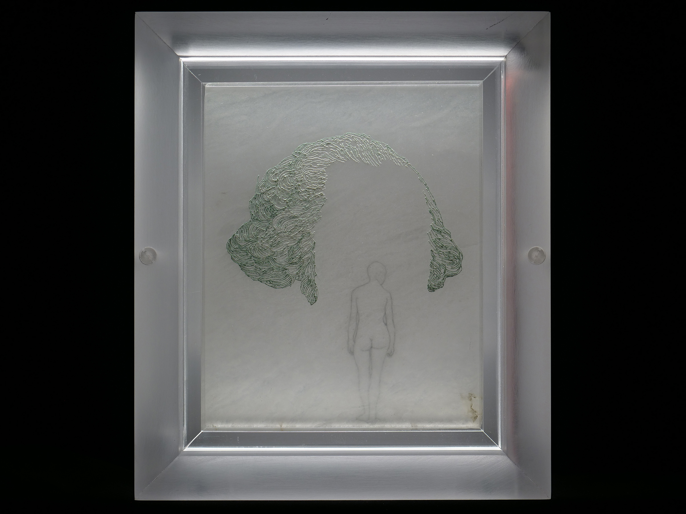 DIMMER CONTROL BOX: This box contains two led drivers with dimmers for control of the top and bottom embedded led cob lights inside the Acrylic frame. Full brightness and dimming control is available. The box includes two 120v extension/power cables and connection leads to the framed artwork – $11,000.00