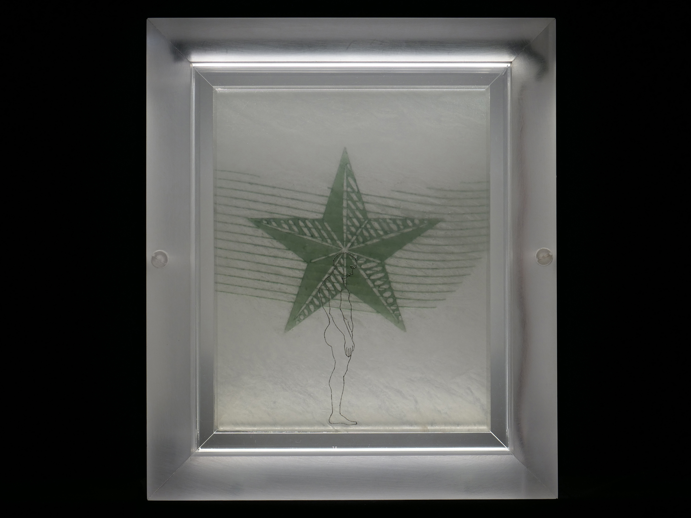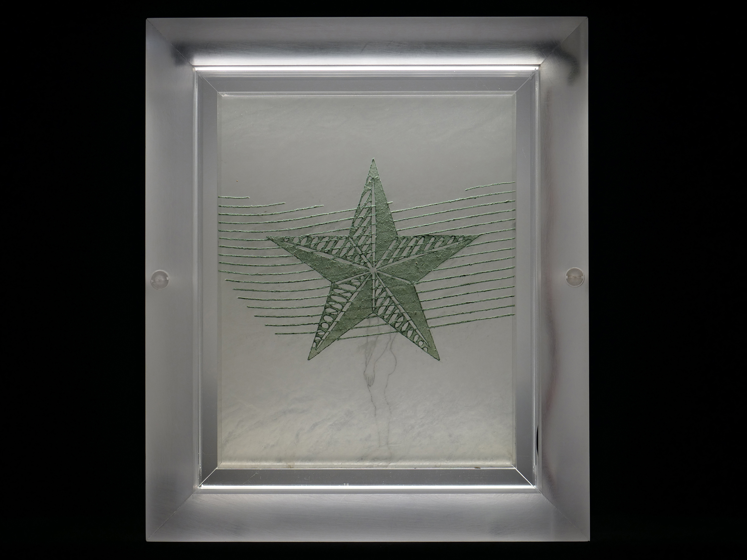 Illuminations; Commissioned by Davis and Louise Reimer, is a series of 30 Translucent Alabaster plates floated and illuminated in Plexiglass frames. Symbols from United States Currency drawn with green Currency ink on one side of the plate, interact with line figures drawn with black currency ink on the reverse side of the alabaster creating a ghostly poetic relationship.
